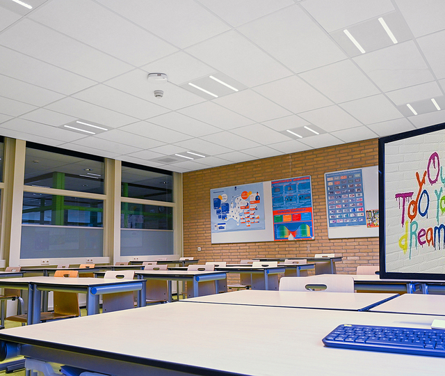 Strategisk placeret i klasseværelser, gange og andre nøgleområder blev disse højkvalitets LED-armaturer valgt for deres gode kvalitet, garanti og imponerende effektivitet pr. watt - afgørende for at maksimere energieffektiviteten i projektet.