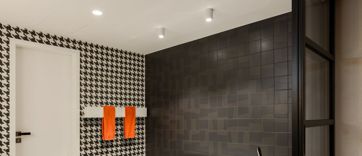 Med deres varme lysfarve på 3000K og en nominel effekt på kun 6,5W er de drejelige LED-spots den ideelle udskiftning af de ineffektive indbyggede halogen-spots. LED-armaturerne giver op til 90 procent energibesparelser og en levetid på op til 50.000 timer (L70/B50) i forhold til den konventionelle teknologi. Det var også muligt at anvende spots på badeværelset takket være tilgængeligheden af IP65-versioner. Dette gjorde det muligt at opnå et ensartet design i de to suiter.