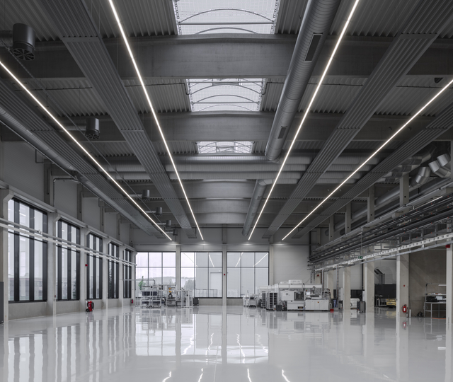 LED-lyskilderne overbeviser med deres kvalitetsdesign, der passer perfekt ind i produktionshallens moderne arkitektur.