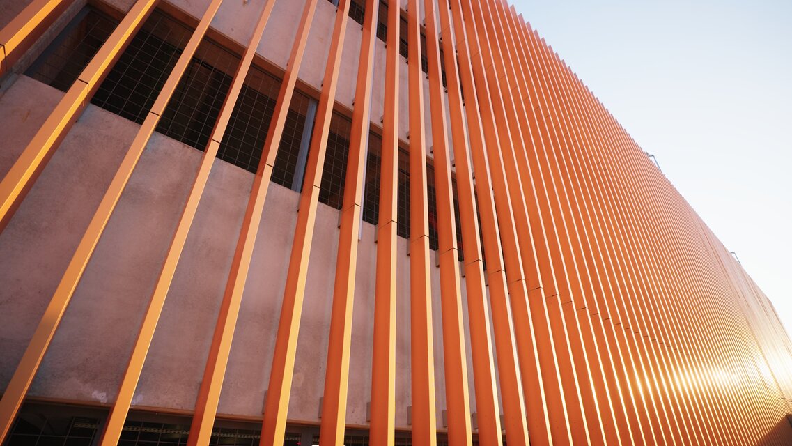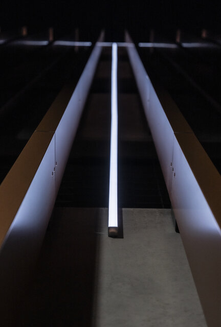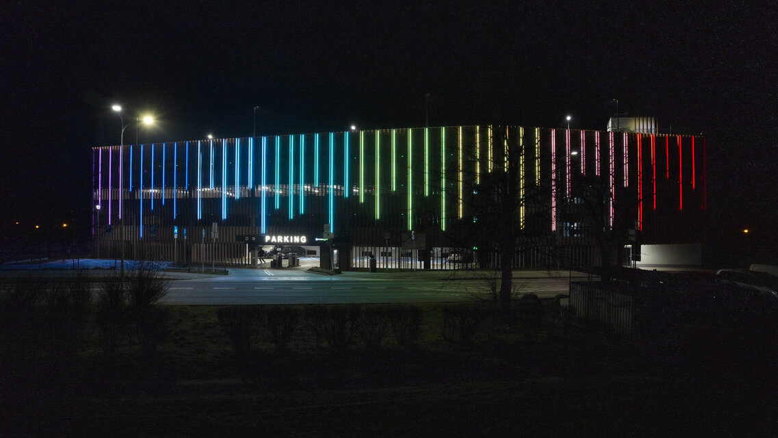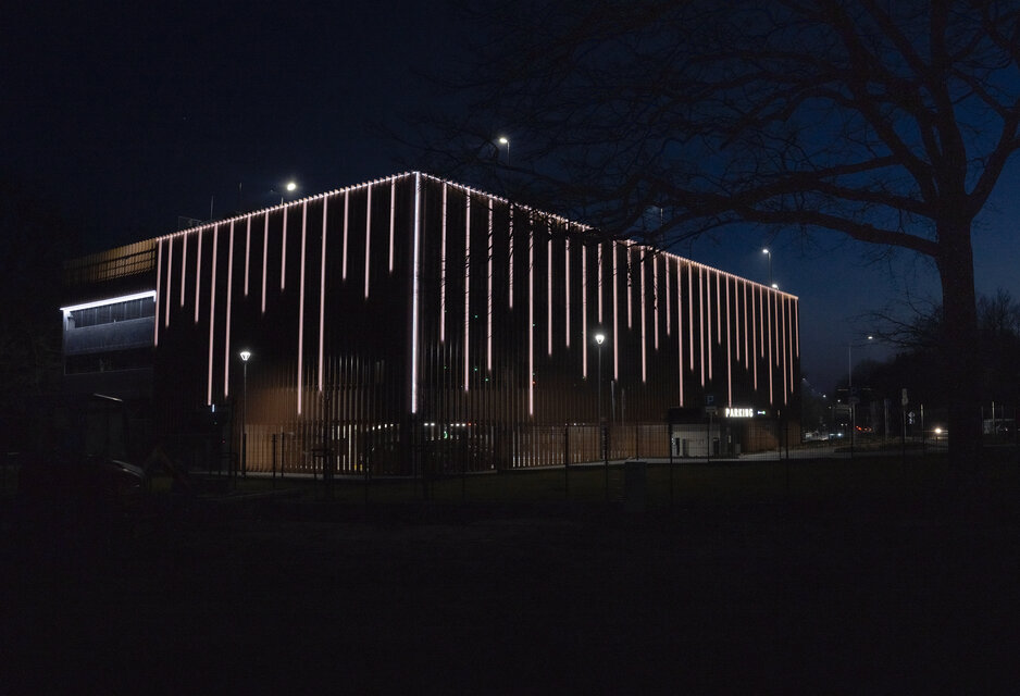 Facaden på parkeringsanlægget har lodrette brune profiler, der løber fra soklen til taget. For at understrege den lette konstruktion er hver fjerde profil oplyst med LED-strips, der løber fra taget og ned – og slutter i forskellige højder. Til dette blev der brugt 585 meter RGBW LED-bånd med høj lysstyrke og IP66-klassificering. Systemet styres trådløst og fjernbetjent via 81 selvstændigt forsynede 24V-drevne enheder. De selvklæbende LED-bånd blev monteret i 293 aluminiumsprofiler, som alle er dækket af matterede diffusorer for at sikre en ensartet lysfordeling.