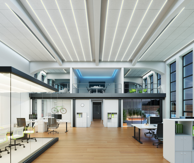 Performance LED-bånd fungerer godt selv som generel belysning i store åbne kontorområder. De giver et højintensivt lys, der fremhæver arkitektoniske effekter på væggen og loftet – ideelt i et aktiverende dagslys hvidt lys. Men det er ikke det eneste. LEDVANCE LED-bånd Performance i 6.500 K, 2.000 lm/m og IP00 er velegnede til effektiv belysning af arbejdspladsen og kan medvirke til et øget velbefindende hos den ansatte.