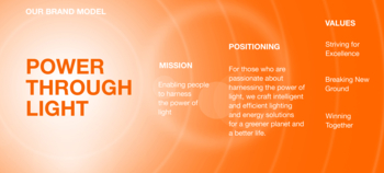 Tro mod vores nye mantra "Power Through Light" (Energi gennem lys) ønsker vi at give vores kunder mulighed for at udnytte lysets energi som aldrig før, som et værktøj til både belysning og produktion af el. Vores intelligente energiløsninger, solteknologi og avancerede belysningssystemer til forbedrede arbejds- og livsmiljøer betyder, at vores kunder drager fordel af denne transformation via reelle besparelser i energiomkostningerne. Samtidig er vi forpligtet til at bidrage til en grønnere planet ved at reducere udledningen af CO2 og mængden af affald gennem bæredygtige produkter, løsninger og processer.