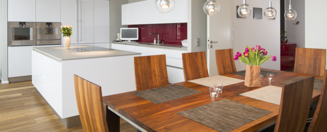 If you have opted for a glass table or a highly reflective high gloss table, a low hanging lamp can be a problem. In this instance, use either indirect light or use a table cloth when dining. LED spotlights integrated in the ceiling are a great idea: they distribute light evenly and do not take up space.